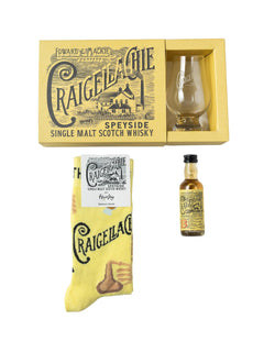 Inside you'll find a 50ml miniature bottle of Craigellachie 13 Year Old Single Malt Scotch Whisky, a Glencarin glass and a pair of exclusive Craigellachie-branded socks, all neatly packaged in a stylish branded gift box.